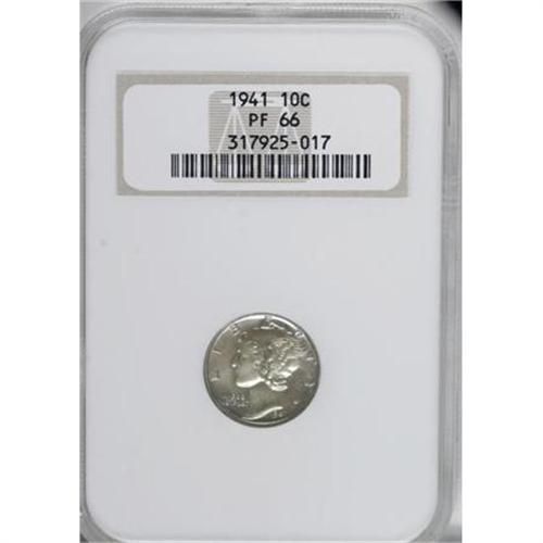 <B>1941 10C PR66 NGC.</B></I> NGC Census: (885/323). PCGS Population (995/305). Mintage: 16,557. Numismedia Wsl. Price for NGC/PCGS coin in PR66: $292. (#5076)<BR><BR><B>Coin Engraver:</B> Adolph A. Weinman<BR><BR><b>Shipping:</b> Coins & Currency (<a target="_blank" href="http://www.heritageauctions.com/common/shipping.php">view shipping information</a>)