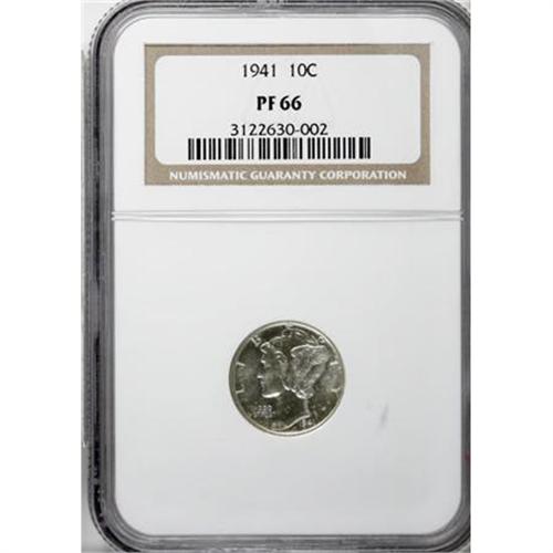 <B>1941 10C PR66 NGC.</B></I> . NGC Census: (912/376). PCGS Population (1000/305). Mintage: 16,557. Numismedia Wsl. Price for NGC/PCGS coin in PR66: $305. (#5076)<BR><BR><B>Coin Engraver:</B> Adolph A. Weinman<BR><BR><b>Shipping:</b> Coins & Currency (<a target="_blank" href="http://www.heritageauctions.com/common/shipping.php">view shipping information</a>)