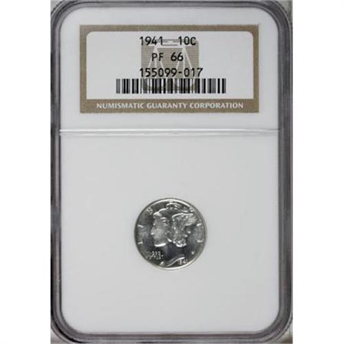 <B>1941 10C PR66 NGC.</B></I> NGC Census: (913/373). PCGS Population (1003/306). Mintage: 16,557. Numismedia Wsl. Price for NGC/PCGS coin in PR66: $300. (#5076)<BR><BR><B>Coin Engraver:</B> Adolph A. Weinman<BR><BR><b>Shipping:</b> Coins & Currency (<a target="_blank" href="http://www.heritageauctions.com/common/shipping.php">view shipping information</a>)