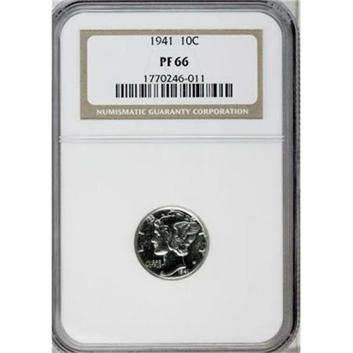 <B>1941 10C PR66 NGC.</B></I> NGC Census: (915/374). PCGS Population (1005/307). Mintage: 16,557. Numismedia Wsl. Price for NGC/PCGS coin in PR66: $300. (#5076)<BR><BR><B>Coin Engraver:</B> Adolph A. Weinman<BR><BR><b>Shipping:</b> Coins & Currency (<a target="_blank" href="http://www.heritageauctions.com/common/shipping.php">view shipping information</a>)