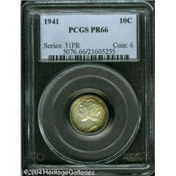 1941 10C PR66 PCGS. Iridescent peach, apple-green, <B>1941 10C PR66 PCGS.</B></I> Iridescent peach, apple-green, and russet colors cede to cream-gray centers. Exquisitely struck and lovingly preserved. <BR><BR><B>Important notice:</B> Heritage usually auctions material at the rate of 200-250 lots per hour. On some occasions eBay Live bid software or the Internet may not be able to keep up with the pace of the auction. We recommend placing a realistic absentee bid now as insurance to avoid disappointment. Occasionally the auctioneer may eliminate or reject an eBay Live bid, and the auctioneer may also reopen a lot after the close of the eBay live bidding (usually because we missed an audience bid), and may reject your bid even if it shows you as the winning bidder. By bidding via eBay Live, you agree that Heritage may award the lot to another bidder at its sole discretion under the circumstances described above or any other reasonable circumstances. Since eBay bids are not shown to us until we open the lot on the floor, we treat those bids just like floor bids. In most cases the floor responds before the eBay bid is presented to us, due to Internet lag time, so for consistency we have made it a policy that floor bids are always considered first over tie eBay live bids. Also please note that all Heritage lots purchased through eBay Live carry a 20% Buyer's Premium. Please make sure you read the Terms and Conditions before you bid. This lot is being auctioned in conjunction with a live floor auction by Heritage Galleries & Auctioneers. All final auction and invoice information will be supplied by Heritage Galleries & Auctioneers, and all other information should be considered preliminary. Lot:5848