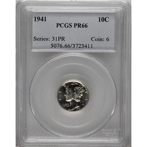 <B>1941 10C PR66 PCGS.</B></I> PCGS Population (975/300). NGC Census: (869/318). Mintage: 16,557. Numismedia Wsl. Price for NGC/PCGS coin in PR66: $304. (#5076)<BR><BR><b>Shipping:</b> Coins & Currency (<a target="_blank" href="http://www.heritageauctions.com/common/shipping.php">view shipping information</a>)