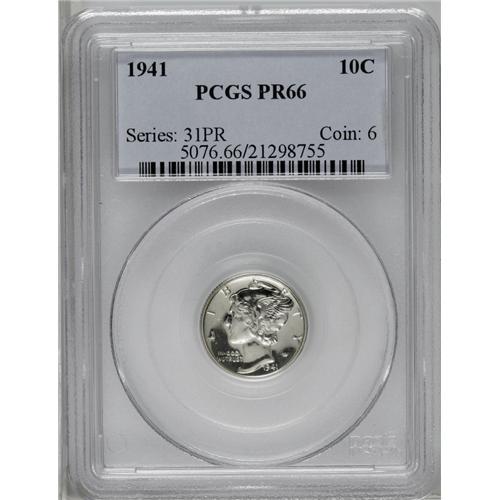 <B>1941<10C> PR66 PCGS.</B></I> Subtle hints of gold color are noted on the razor-sharp Premium Gem proof Mercury dime. The surfaces are virtually pristine.