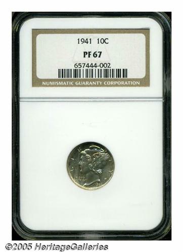 <B>1941<10C> PR67 NGC.</B></I> Beautiful gold, aqua, and ruby hues lightly endow this flashy and magnificently preserved Superb Gem. An imposing proof type coin.