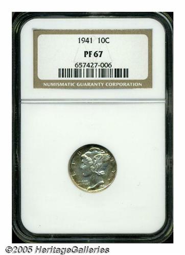 <B>1941<10C> PR67 NGC.</B></I> Pastel golden-brown and emerald-green colors grace this razor-sharp and lovingly preserved Superb Gem. An impressive example of the proof type.