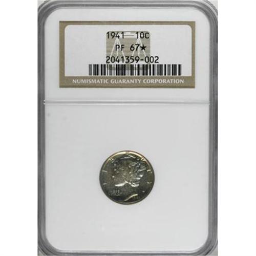 <B>1941 10C PR67</B></I> S<B> NGC.</B></I> NGC Census: (285/38). PCGS Population (287/15). Mintage: 16,557. Numismedia Wsl. Price for NGC/PCGS coin in PR67: $460. (#5076)<BR><BR><B>Coin Engraver:</B> Adolph A. Weinman<BR><BR><b>Shipping:</b> Coins & Currency (<a target="_blank" href="http://www.heritageauctions.com/common/shipping.php">view shipping information</a>)