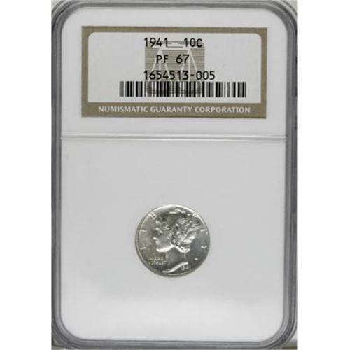 <B>1941 10C PR67 NGC.</B></I> NGC Census: (332/45). PCGS Population (292/15). Mintage: 16,557. Numismedia Wsl. Price for NGC/PCGS coin in PR67: $475. (#5076)<BR><BR><B>Coin Engraver:</B> Adolph A. Weinman<BR><BR><b>Shipping:</b> Coins & Currency (<a target="_blank" href="http://www.heritageauctions.com/common/shipping.php">view shipping information</a>)