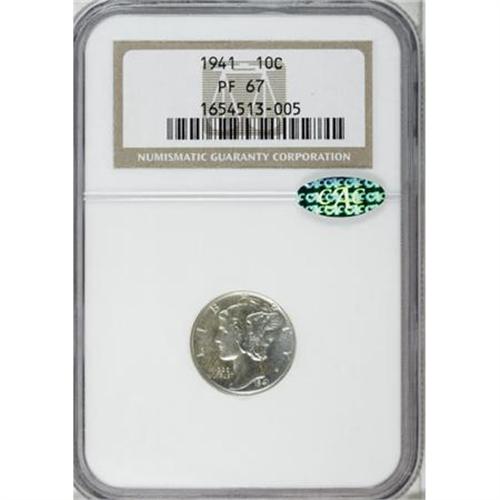 <B>1941 10C PR67 NGC, CAC.</B></I> NGC Census: (329/45). PCGS Population (292/15). Mintage: 16,557. Numismedia Wsl. Price for NGC/PCGS coin in PR67: $470. (#5076)<BR><BR><B>Coin Engraver:</B> Adolph A. Weinman<BR><BR><b>Shipping:</b> Coins & Currency (<a target="_blank" href="http://www.heritageauctions.com/common/shipping.php">view shipping information</a>)