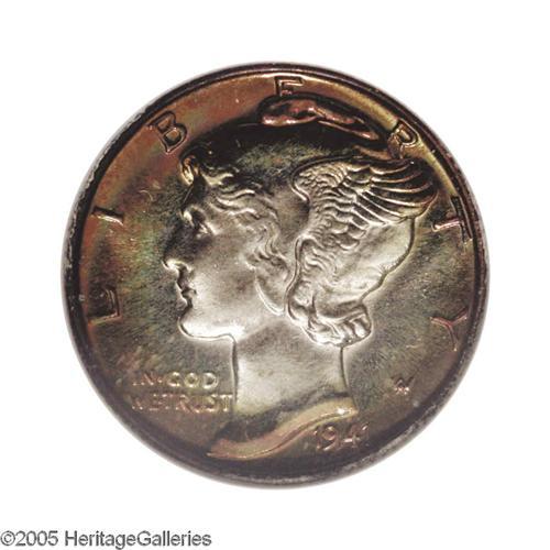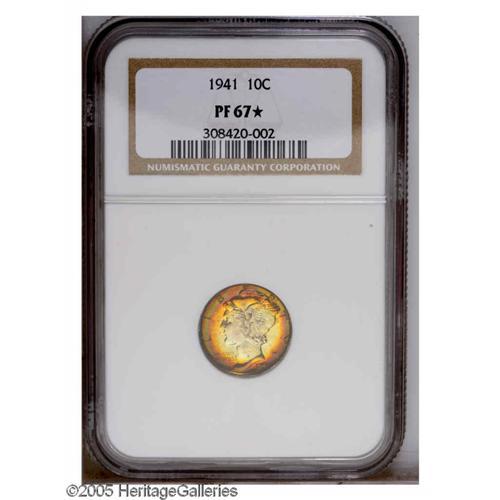 <B>1941<10C> PR67 <S NGC.</B></I> This Superb Gem Mercury proof has light mint-green color at the center of the obverse that is bordered with magenta, crimson, and jade-green patina. The reverse is a mottled golden-brown color. It displays brilliant luster, razor-sharp strike detail, and seemingly mark-free surfaces.<BR><I>From The Henry R. Luhrs Collection.</B></I>