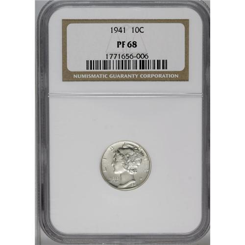 <B>1941<10C> PR68 NGC.</B></I> Fully struck and brilliant with a dynamically reflective appearance and unmarked proof surfaces that display very glassy fields. Census: 27 in 68, 0 finer (3/06).