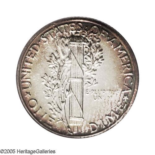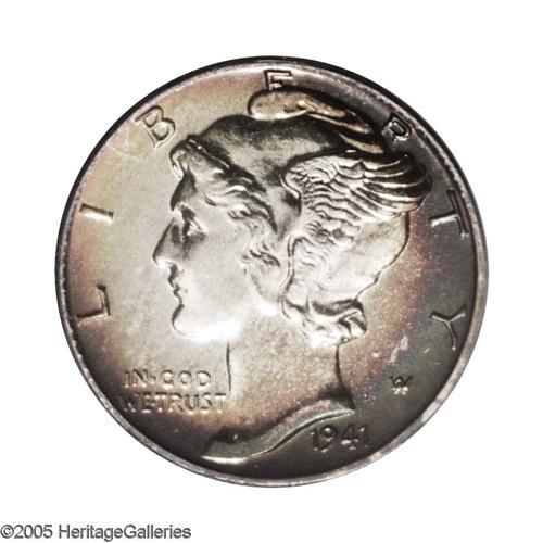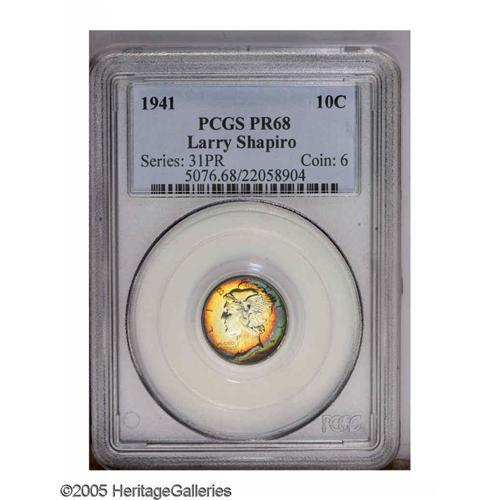 <B>1941<10C> PR68 PCGS.</B></I> A spectacular Superb Gem that boasts vibrant and deep rainbow toning around the obverse and reverse, the centers are toned an attractive yellow-gold, and the surfaces are exceptional. For the collector, obtaining a Gem Proof is a reasonable goal, but locating one with such wonder toning is a challenge. The present collection offers collectors multiple specimens that have rainbow toning seldom seen on such top quality coins, a perfect combination for the numismatist. Population: 14 in 68, 0 finer (12/05).<BR><I>From The Larry Shapiro Proof Mercury Dimes PCGS Registry Set.</B></I>