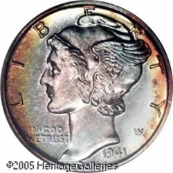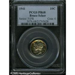 <B>1941 10C PR68 PCGS.</B></I> In addition to nearly perfect mirror surfaces, this peerless specimen is outlined in glorious mint-green and amber iridescent toning. If it is the ultimate in color and quality you seek in a proof Mercury Dime, look no further. Population: 14 in 68, 0 finer (1/05).<BR><I>From the Bruce Scher #1 All-Time PCGS Registry Set.</B></I> Lot:4081