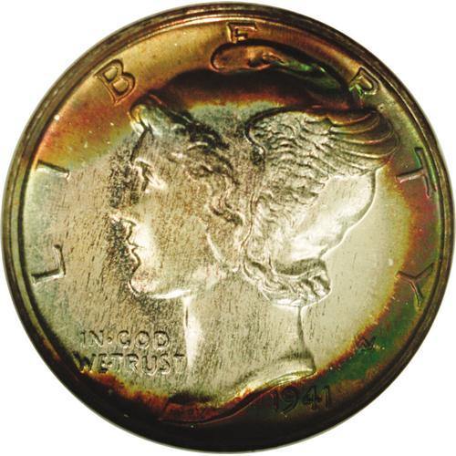 <B>1941<10C> PR68 <img border='0' src='http://www.heritagecoins.com/images/star.gif' width=10 height=10> NGC.</B></I> Peach, rose-red, and lime-green colors alternate across the obverse margin, and are also found on the reverse border, although to a lesser degree. The cream-gray centers display dashes of gold and aqua color. Essentially fully struck and immaculate, this beautiful Superb Gem would be a colorful highlight of a proof Mercury dime collection. Census: 7 in 68 <img border='0' src='http://www.heritagecoins.com/images/star.gif' width=10 height=10>, 0 finer (2/06).