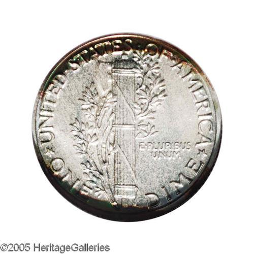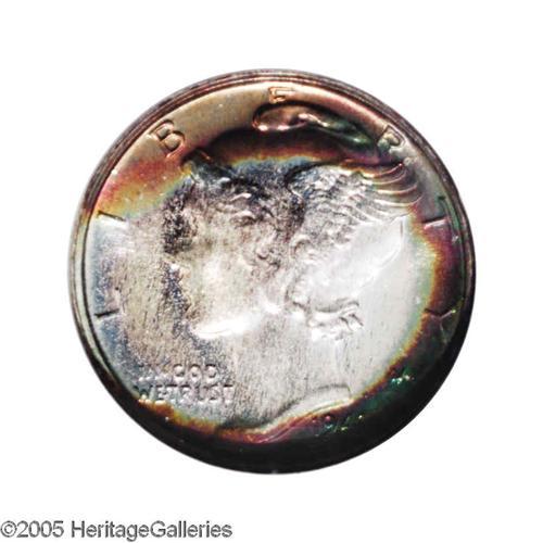 <B>1941<10C> PR68 <S NGC.</B></I> Peach, rose-red, and lime-green colors alternate across the obverse margin, and are also found on the reverse border, although to a lesser degree. The cream-gray centers display dashes of gold and aqua color. Essentially fully struck and immaculate, this beautiful Superb Gem would be a colorful highlight of a proof Mercury Dime collection. Census: 7 in 68 <S, 0 finer (10/05).