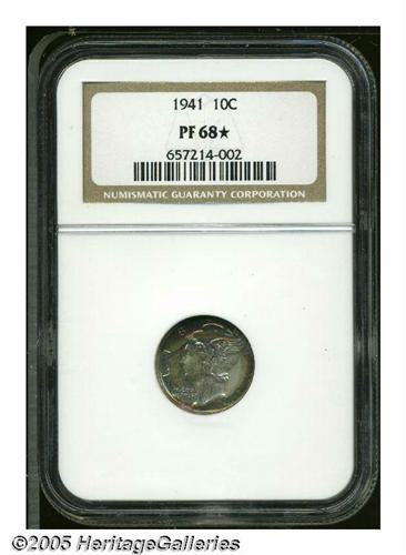 <B>1941<10C> PR68 <S NGC.</B></I> Superlative, with glassy surfaces and rainbow peripheries. As expected, essentially perfect, with the high eye appeal one would expect of a Superb-Gem.