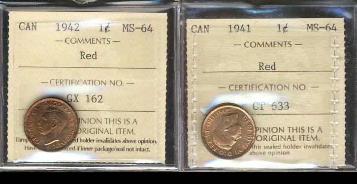 1941 & 1942 1¢ ICCS MS64RD. Lot of 2 coins.