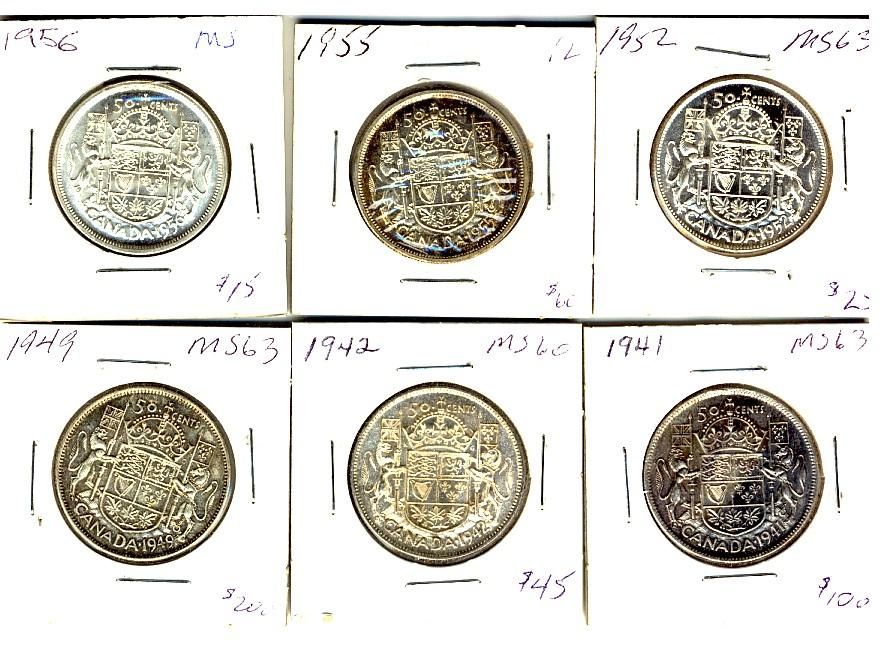 1941, 1942, 1949, 1952, 1955 & 1956 50¢. Lot of 6 coins all MS60+++.