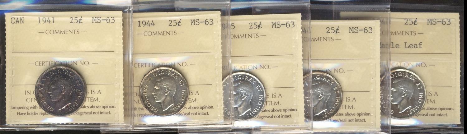 1941, 1944. 1945, 1947, 1947 ML, all ICCS MS63, Lot of 5 coins,