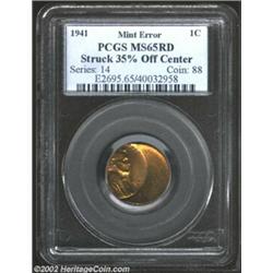 1941 1C Cent--Struck 35% Off Center--MS65 Red PCGS. Sparkling, full red mint luster, the coin actual