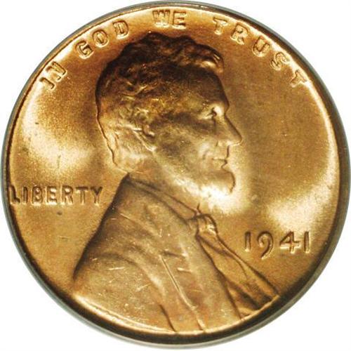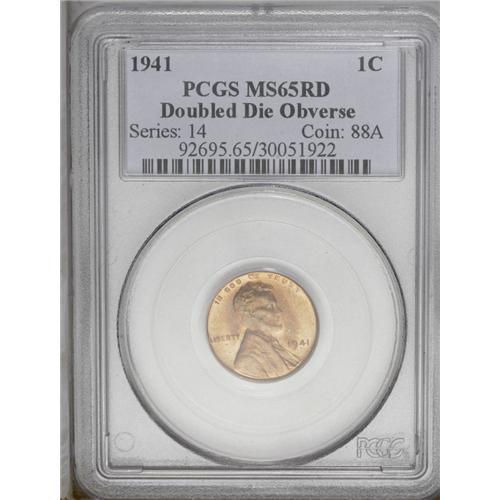 <B>1941<1C> Doubled Die MS65 Red PCGS.</B></I> FS-018. Doubling is clearest on the BE of LIBERTY, IN GOD TRUST, and in the crossbar of the 4 in the date. Usually found in low grades, this lustrous specimen has copper-gold color accented with forest-green around the center of the obverse. Boldly struck and well preserved. A handful of small marks are noted on the obverse, but they do not seem inconsistent with the Gem grade designation.