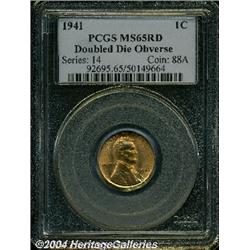 <B>1941<1C> Doubled Die MS65 Red PCGS.</B></I> Doubling is clearest on the BE of LIBERTY, and on the letters in TRUST of the motto. Usually found in low grades, this Gem has lustrous, copper-gold color accented with pale-green. A few small marks on Lincoln's face are mentioned for accuracy. Population: 8 in 65, 15 finer (9/04). <BR><BR><B>Important notice:</B> Heritage usually auctions material at the rate of 200-250 lots per hour. On some occasions eBay Live bid software or the Internet may not be able to keep up with the pace of the auction. We recommend placing a realistic absentee bid now as insurance to avoid disappointment. Occasionally the auctioneer may eliminate or reject an eBay Live bid, and the auctioneer may also reopen a lot after the close of the eBay live bidding (usually because we missed an audience bid), and may reject your bid even if it shows you as the winning bidder. By bidding via eBay Live, you agree that Heritage may award the lot to another bidder at its sole discretion under the circumstances described above or any other reasonable circumstances. Since eBay bids are not shown to us until we open the lot on the floor, we treat those bids just like floor bids. In most cases the floor responds before the eBay bid is presented to us, due to Internet lag time, so for consistency we have made it a policy that floor bids are always considered first over tie eBay live bids. Also please note that all Heritage lots purchased through eBay Live carry a 20% Buyer's Premium. Please make sure you read the Terms and Conditions before you bid.
