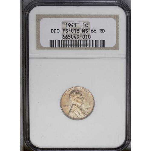 <B>1941<1C> Doubled Die MS66 Red NGC.</B></I> FS-018. First of three known Doubled Dies for 1941, this variety is identifiable by obverse doubling on the letters in LIBERTY, GOD, and TRUST, as well as on the 4 in the date. This is an exceptionally pleasing coin that displays bright, swirling, red and green tinged mint luster. There are no obvious or distracting field marks on this important coin, but an interesting patch of die chips (as struck) surround the lower shaft of the left reverse wheat ear. Census: 7 in 66, 1 finer (2/06).