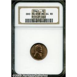 <B>1941 1C Doubled Die Obverse MS64 Red NGC.</B></I> FS-018. Doubling is clearest on the IBER of LIBERTY, and IN GOD TRUST, and in the cross bar of the 4 in the date. Ruby-red and olive colors enrich this lustrous near-Gem. A tick on the field near the mouth is all that denies a higher grade.