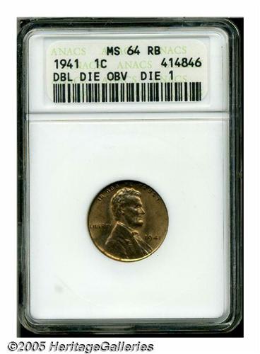 <B>1941<1C> MS64 Red and Brown ANACS.</B></I> Noticeable doubling is seen on LIBERTY and IN GOD WE TRUST. A mostly red example of this interesting, elusive variety.<BR><I>From The Western Hills Collection.</B></I>