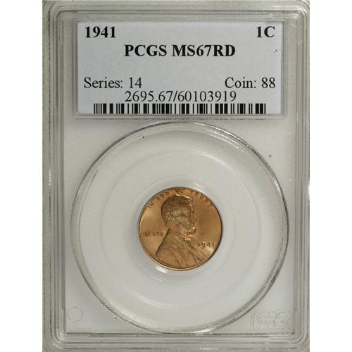 <B>1941 1C MS67 Red PCGS.</B></I> PCGS Population (148/1). NGC Census: (1336/0). Mintage: 887,039,104. Numismedia Wsl. Price for NGC/PCGS coin in MS67: $100. (#2695)<BR><BR><b>Shipping:</b> Coins & Currency (<a target="_blank" href="http://www.heritageauctions.com/common/shipping.php">view shipping information</a>)