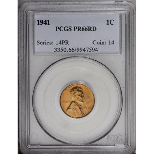 <B>1941<1C> PR66 Red PCGS.</B></I> A beautifully reflective red-gold Premium Gem, with a faint coating of milky color on both sides. Razor-sharp and seemingly pristine, a lovely proof Lincoln cent. Just three pieces have been graded finer by PCGS (1/06).
