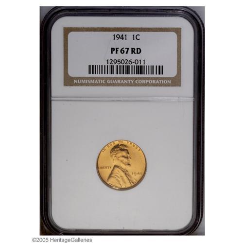 <B>1941<1C> PR67 Red NGC.</B></I> The radiant pumpkin-orange color is seamless except for a trivial fleck above the N in CENT. The strike is exacting, and the eye appeal is splendid. Cents are the most difficult denomination to find in high quality within proof sets of the 1936 to 1942 era, because they are subject to carbon and other discoloration. The rarity of exemplary full Red specimens has not been fully appreciated by collectors, although Registry collecting may eventually change this. Population: 4 in 67, 0 finer (9/05).<BR><I>From The Sounder Collection.</B></I>