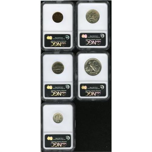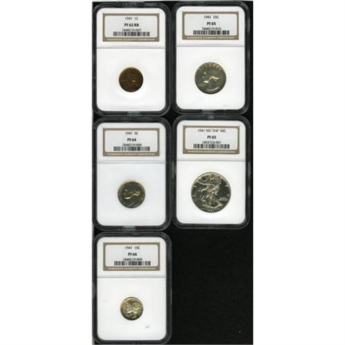 <B>1941 1C Proof Set PR62 to PR66 NGC.</B></I> The set includes: <B>cent PR62 Red and Brown,</B></I> lovely orange-gold with minimal carbon but a few wispy hairlines are present; <B>nickel PR64,</B></I> essentially fully struck, streaky almond-gold toning; <B>dime PR66,</B></I> pinpoint-sharp, attractive peripheral obverse honey, rose, and lime toning; <B>quarter PR65,</B></I> a splendid Gem with dappled green-gold patina; and a <B>No AW half dollar PR65,</B></I> an untoned and unmarked Gem with a hint of frost on the obverse motif.<BR><BR><b>Shipping:</b> Coin/Currency (<a target="_blank" href="http://www.heritageauctions.com/common/shipping.php">view shipping information</a>)