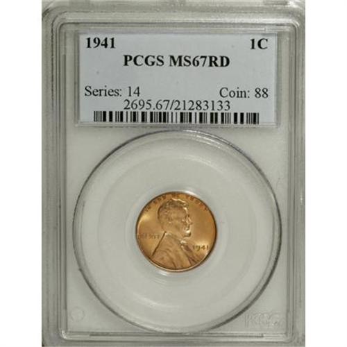 <B>1941 1C MS67 Red PCGS.</B></I> PCGS Population (148/1). NGC Census: (679/0). Mintage: 887,039,104. Numismedia Wsl. Price for NGC/PCGS coin in MS67: $100. (#2695)<BR><BR><B>Coin Engraver:</B> Victor D. Brenner<BR><BR><b>Shipping:</b> Coins & Currency (<a target="_blank" href="http://www.heritageauctions.com/common/shipping.php">view shipping information</a>)