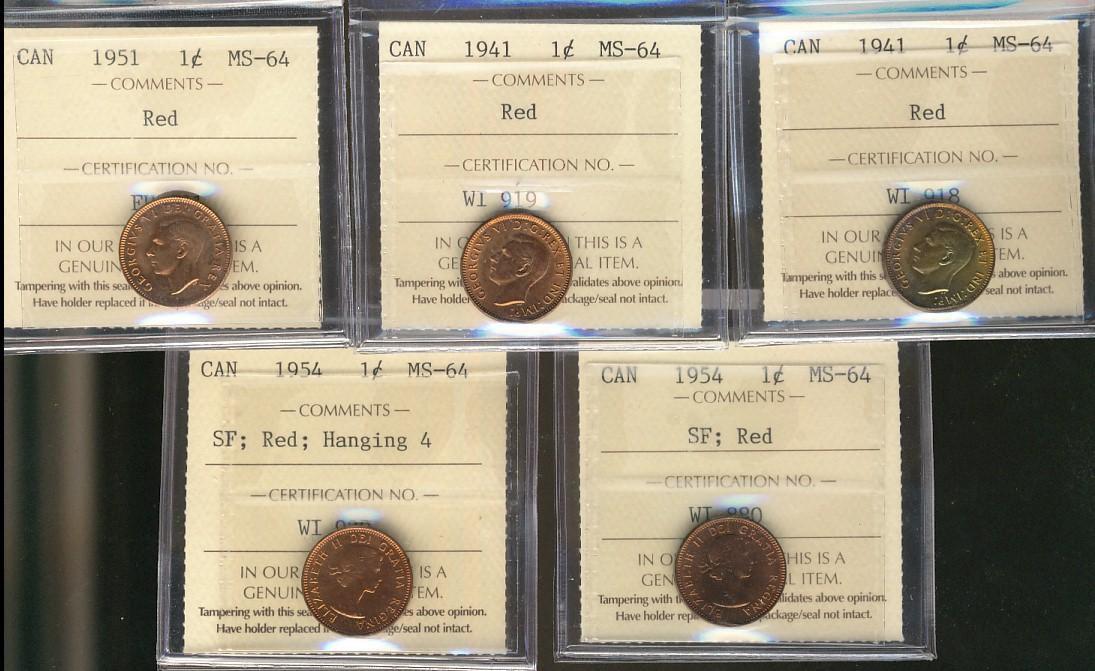 1941(2) 1¢, 1951, 1954 SF & 1954 SH Hanging 4 ICCS MS64RD. Lot of of 5 coins.