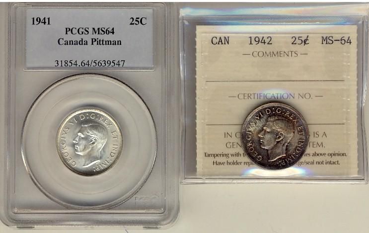 1941 25¢ PCGS & 1942 ICCS 25¢. Lot of 2 coins both MS64. The 1941 is a Pittman example.