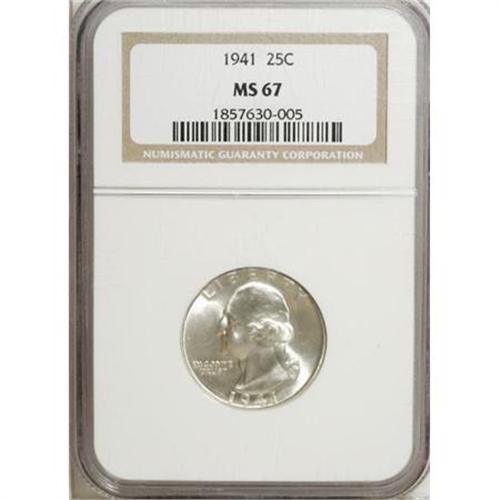 <B>1941 25C MS67 NGC.</B></I> NGC Census: (182/3). PCGS Population (72/0). Mintage: 79,047,288. Numismedia Wsl. Price: $340. (#5814)<BR><BR><B>Coin Engraver:</B> John Flanagan<BR><BR><b>Shipping:</b> Coin/Currency (<a target="_blank" href="http://www.heritageauctions.com/common/shipping.php">view shipping information</a>\)