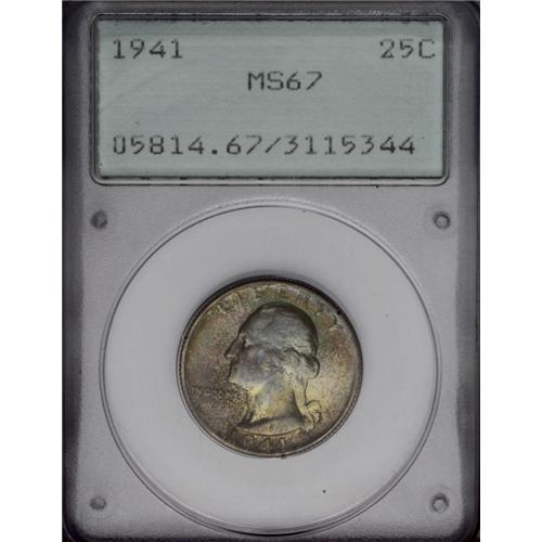 <B>1941<25C> MS67 PCGS.</B></I> A spectacular 1941 Washington that benefits from nearly flawless surface preservation and mottled iridescent accents that are most colorful about the margins. Housed in a 1st generation PCGS holder. Population: 59 in 67, 0 finer (3/06).
