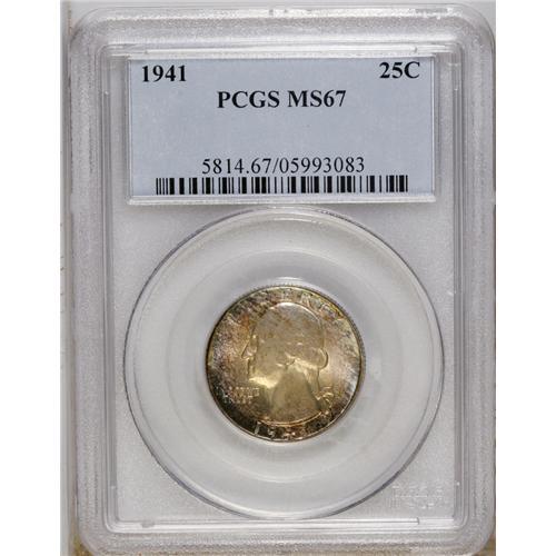 <B>1941 25C MS67 PCGS.</B></I> Highly lustrous surfaces display low intensity multicolored toning throughout the obverse and along the margins of the reverse. Sharply struck, and no significant marks to report. Population: 71 in 67, 0 finer (11/06).<BR><BR><b>Shipping:</b> Coin/Currency (<a target="_blank" href="http://www.heritageauctions.com/common/shipping.php">view shipping information</a>)