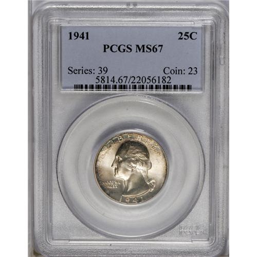 <B>1941<25C> MS67 PCGS.</B></I> Sparkling luster with bold definition. The surfaces are near-flawless and display attractive golden toning with midnight-blue peripheral highlights. Population: 61 in 67, 0 finer (5/06).
