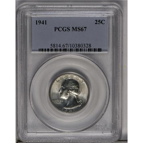 <B>1941<25C> MS67 PCGS.</B></I> While this piece appear at first glance to be fully brilliant, close inspection with a glass reveals a thin, barely discernible layer of light tan color. The surfaces display intense luster, sharply struck devices, and just a couple of minor ticks on Washington's forehead. Population: 66 in 67, 0 finer (6/06).