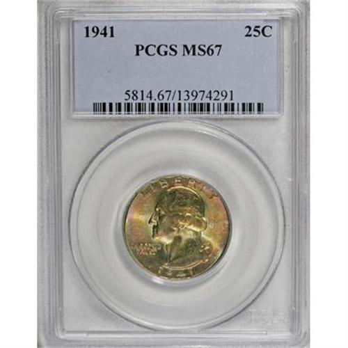 <B>1941 25C MS67 PCGS.</B></I> Both sides of this shining and solidly struck quarter show vibrant luster beneath rich golden toning that sports emerald and rose accents. An incredibly appealing Superb Gem, tied for the finest certified by PCGS (10/07).<BR><BR><B>Coin Engraver:</B> John Flanagan<BR><BR><b>Shipping:</b> Coins & Currency (<a target="_blank" href="http://www.heritageauctions.com/common/shipping.php">view shipping information</a>)
