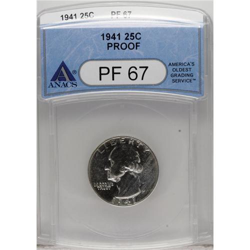 <B>1941 25C PR67 ANACS.</B></I> NGC Census: (362/48). PCGS Population (133/0). Mintage: 15,287. Numismedia Wsl. Price for NGC/PCGS coin in PR67: $380. (#5980)<BR><BR><b>Shipping:</b> Coins & Currency (<a target="_blank" href="http://www.heritageauctions.com/common/shipping.php">view shipping information</a>)