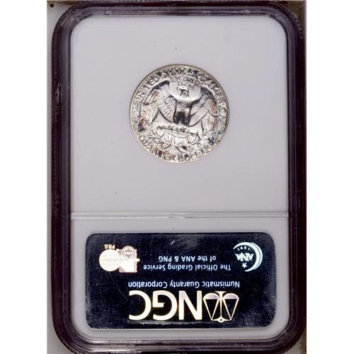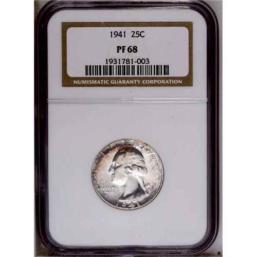 <B>1941<25C> PR68 NGC.</B></I> Freckles of golden-russet and ocean-blue color endow the margins of this fully struck and splendidly preserved Superb Gem. A lovely example of this World War Two proof quarter issue. None have been certified in finer grades by either leading service. Census: 19 in 68, 0 finer (3/06).