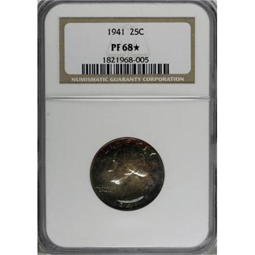 <B>1941 25C PR68 </B></I> S<B> NGC.</B></I> This early proof Washington quarter offers exceptional visual appeal. The obverse is fully toned in shades ranging from light champagne to blue-green and deep russet. The reverse is mostly brilliant at the center, with pleasing peripheral iridescence. Census: 4 in 68 <B> S</B></I>, none finer (8/07).<BR><BR><B>Coin Engraver:</B> John Flanagan<BR><BR><b>Shipping:</b> Coins & Currency (<a target="_blank" href="http://www.heritageauctions.com/common/shipping.php">view shipping information</a>)