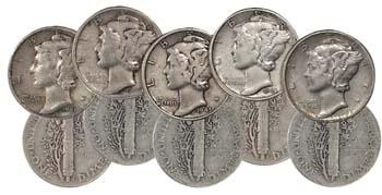 Introduced during World War I, the "Mercury" actually displays not a Roman god, but a female personification of Liberty, whose winged cap was intended to represent Freedom of Thought. Our set contains all 27 dates of issue (we'll choose amint in each case); none was struck in 1922, 1932 and 1933). You'll even receive the very elusive 1921 Philadelphia issue, the key date in the series. Gradings range from Good to Fine quality. Folder included.