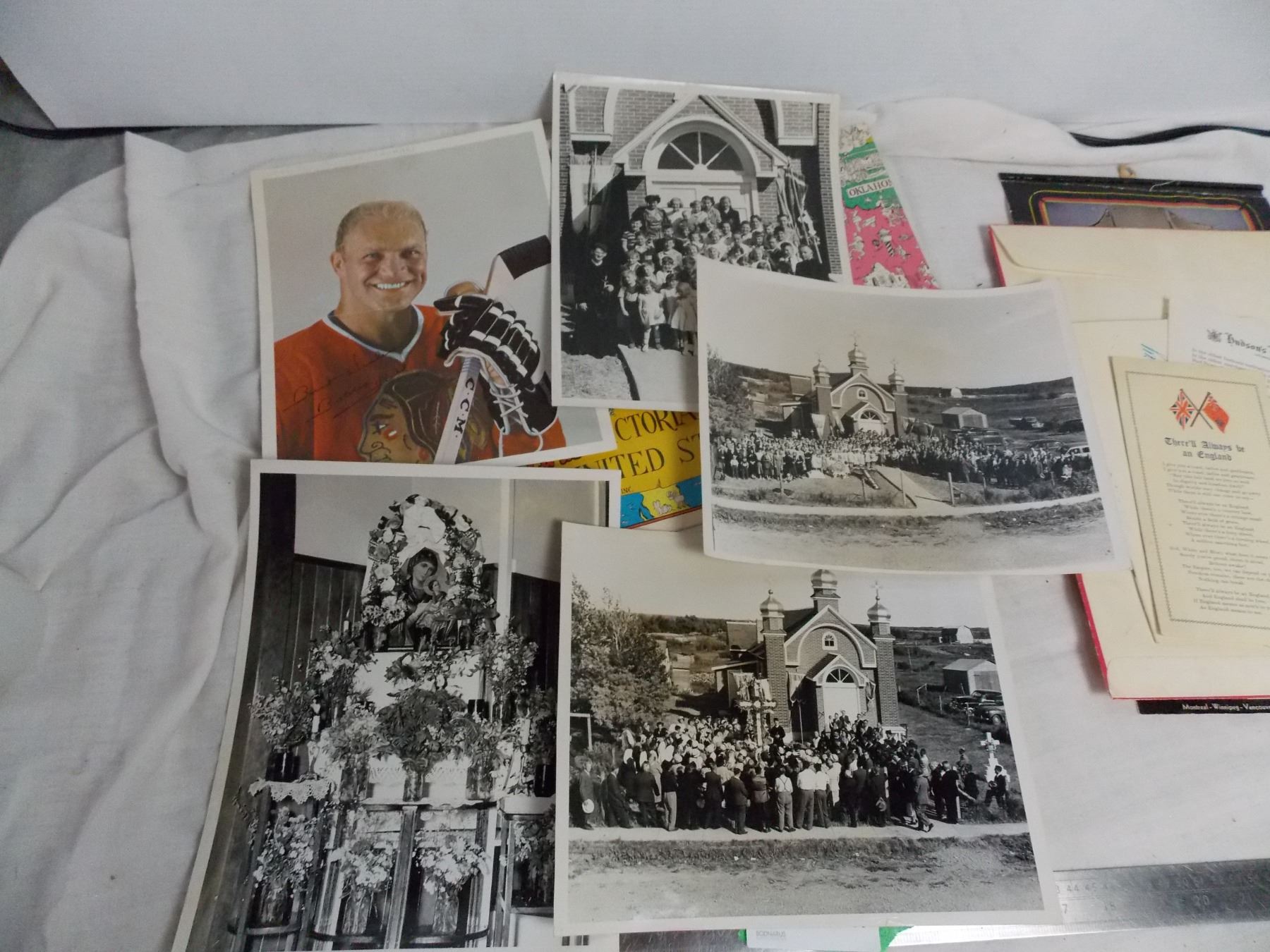 1941-48 calendars + 1981 mad magazine map, bobby hull photo, miscchurch photos, model T puzzle sleeve