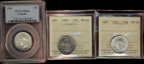 1941-49 25¢, Lot of 3 coins all MS64, includes 1 x 1949 PCGS MS64, 1 x 1949 ICCS MS64 & 1 x 1941 ICCS MS64. All superb quality coins.