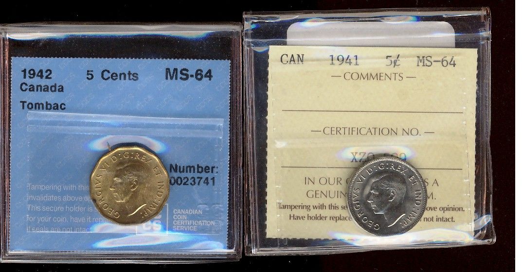 1941 5¢ ICCS & 1942 Tombac CCCS both MS64. Lot of 2 coins.