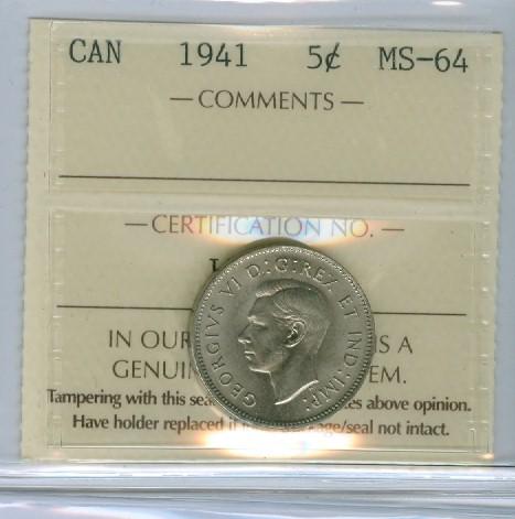 1941 5¢ ICCS MS64. Brilliant and lustrous.