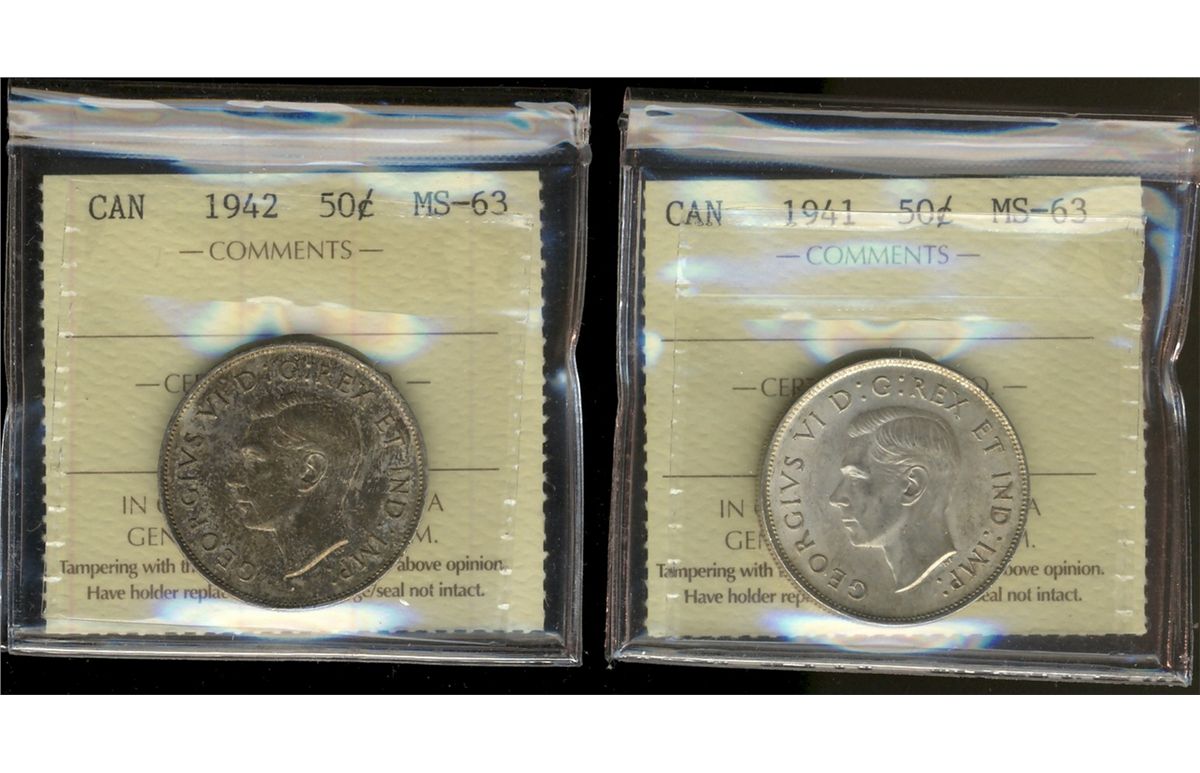 1941 50¢ & 1942 ICCS MS64. Lot of 2 coins.